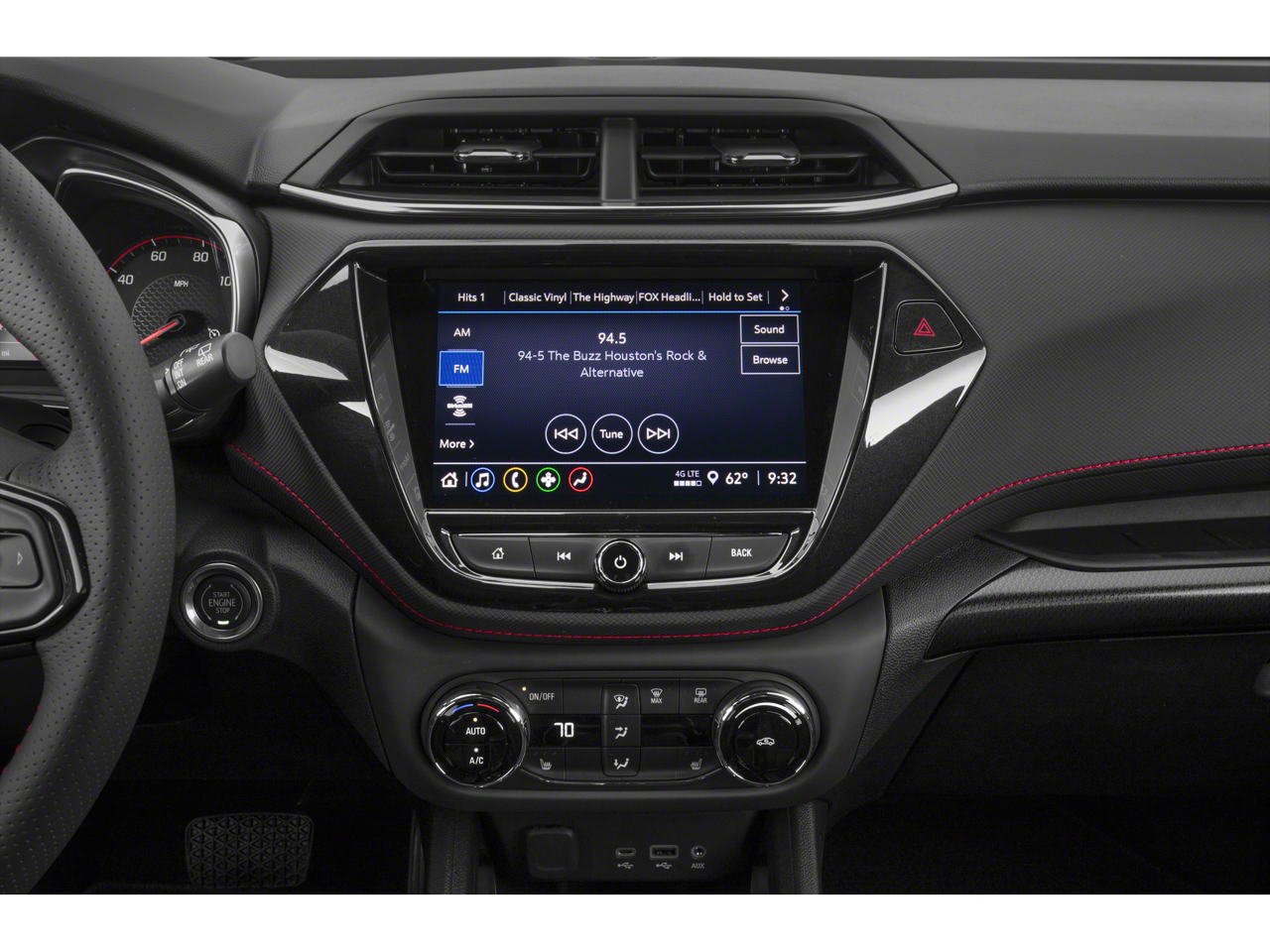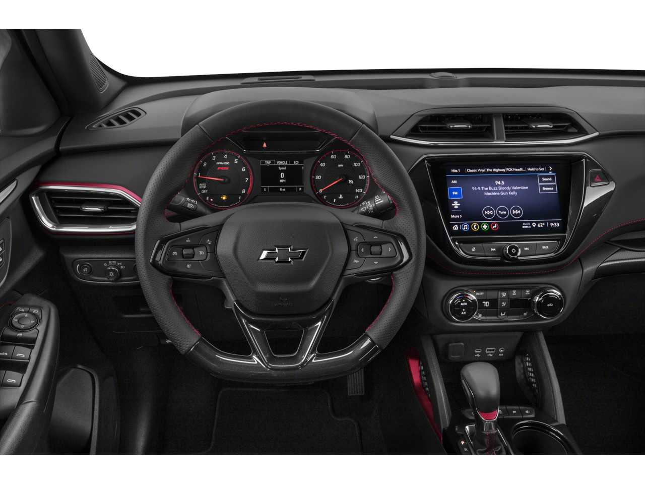 Inside, the Trailblazer RS features a driver-focused cabin with sporty red accents, comfortable seating, and advanced technology. Enjoy a user-friendly infotainment system with Apple CarPlay, Android Auto, a touchscreen display, Bluetooth® connectivity, and multiple USB ports to keep you connected on every drive.